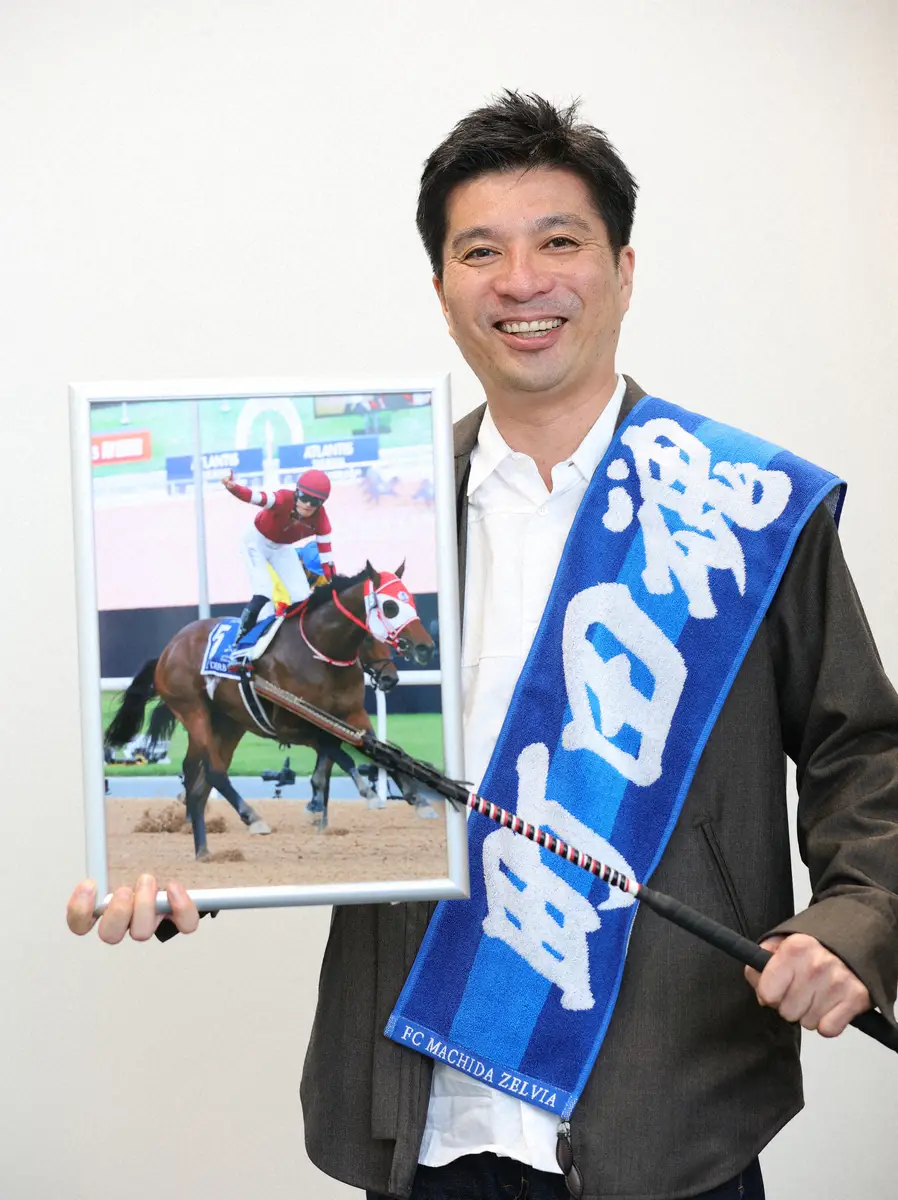 愛馬の写真と所有するサッカーチームのタオルを持って笑顔の経営者。