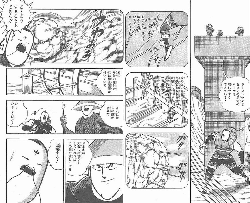 おおっラーメンマンが怒りに燃えてヌンチャクを手に取った!修行の成果を見せてくれるんや!