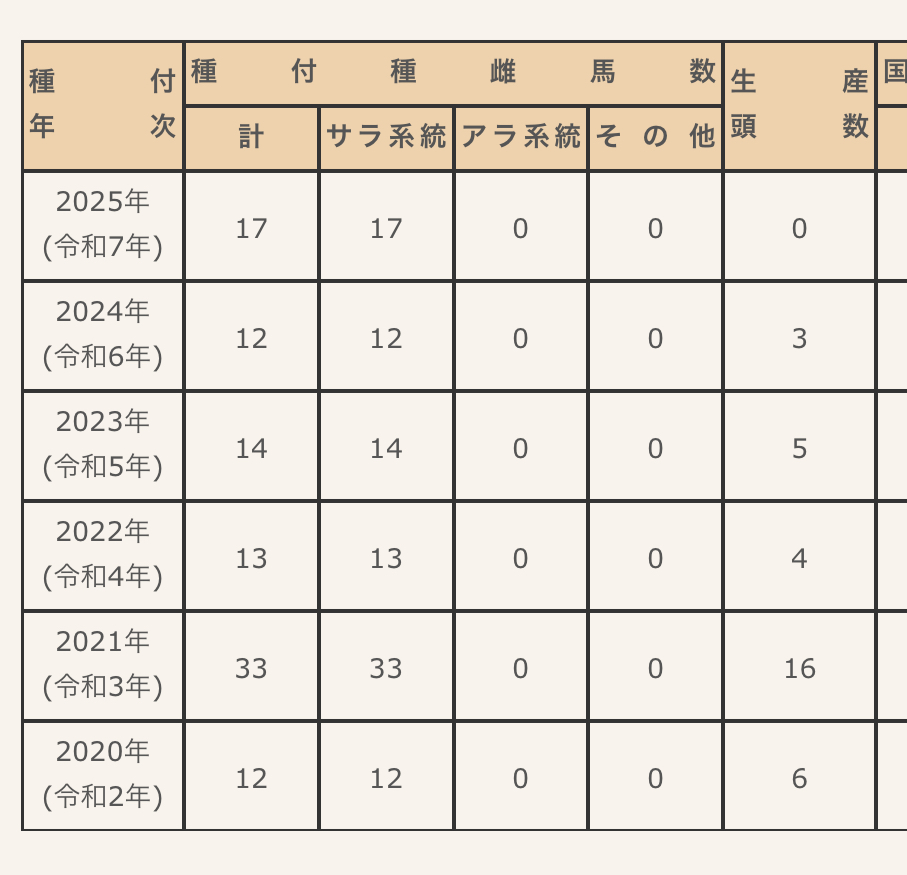 ただ、2022年以降の種付け相手の殆どが導入した本田牧場の繁殖牝馬だから本田牧場が新種牡馬を入れない限りは種付け数が大きく減ることはないと思う