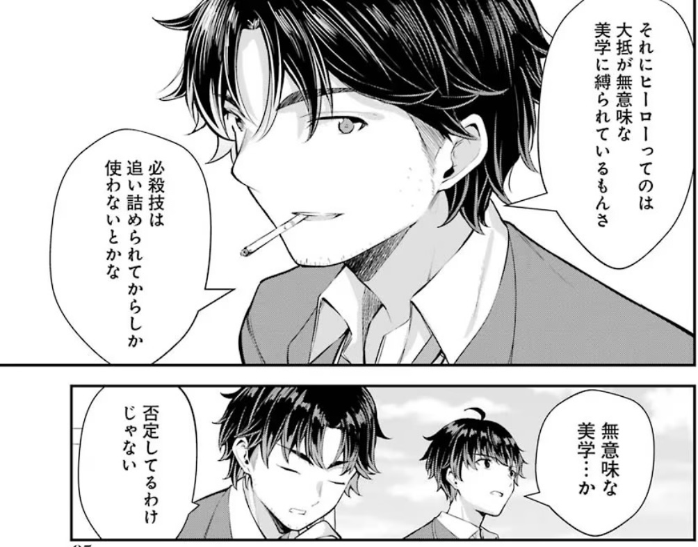 このコマだけで判断するのもアレだけどヒーローが最初に必殺技を撃たない背景を考えたり想像するんじゃなく表面だけで無意味な美学って言い切るのが浅さを感じる、その後に否定してないって保身に入るのが最高にダサい