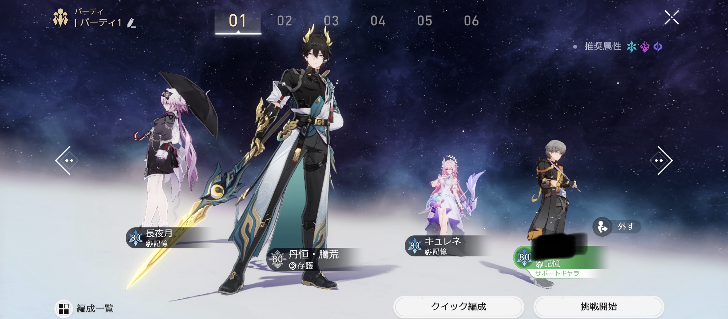 1戦目はせっかくなのでとやってみたかったキュレネ(お試し)、存護丹恒(無餅)、長夜月、記憶開拓者でなんとか勝ち