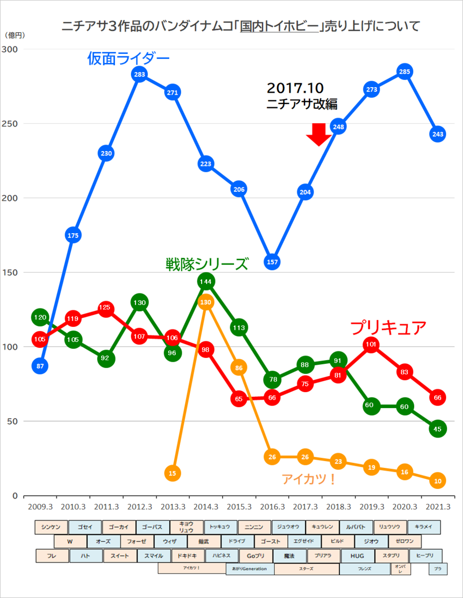 なんというかライダーが多人数化したり対象年齢がライダーの方が高くて上の方に展開していってファンを手放さなかったりで色々展開して行ってたし、結局ライダーにパイを奪われ続けて数少ない強みのロボが売れなくなって頑張ってたけどルパパトで落ちて再起不能になったみたいな感じがするのは俺なんだよね