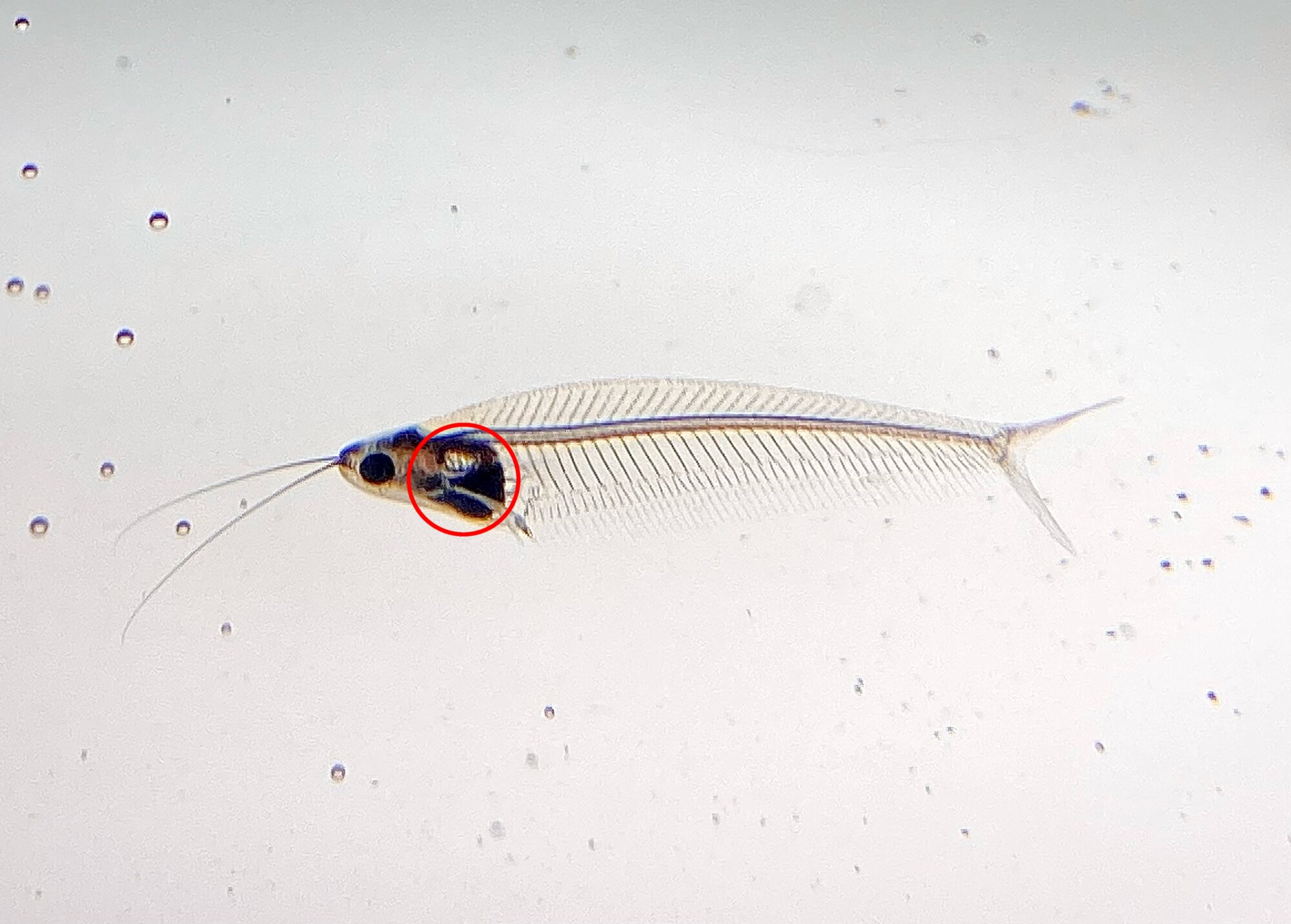 この赤い丸で囲まれた部分に内臓が収まっていますから、この部分が餌の量によって多少膨らむくらいで、その後ろにある透明な部分自体の大きさはさほど変わらないんですよ。