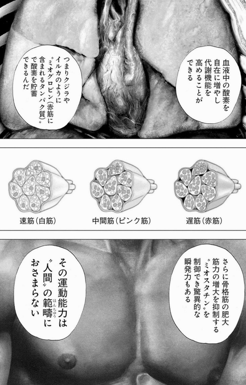 要約する前に前のコマで“ミオグロビン(赤色筋肉)”とか言ってるけどミオグロビン自体は筋肉じゃなくてそこに含まれるタンパク質だそうっス