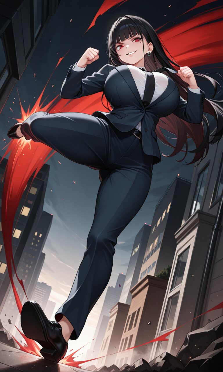 1girl, solo, long hair, black hair, blunt bangs, red eyes, male under each eye, huge breasts, evil smile,
