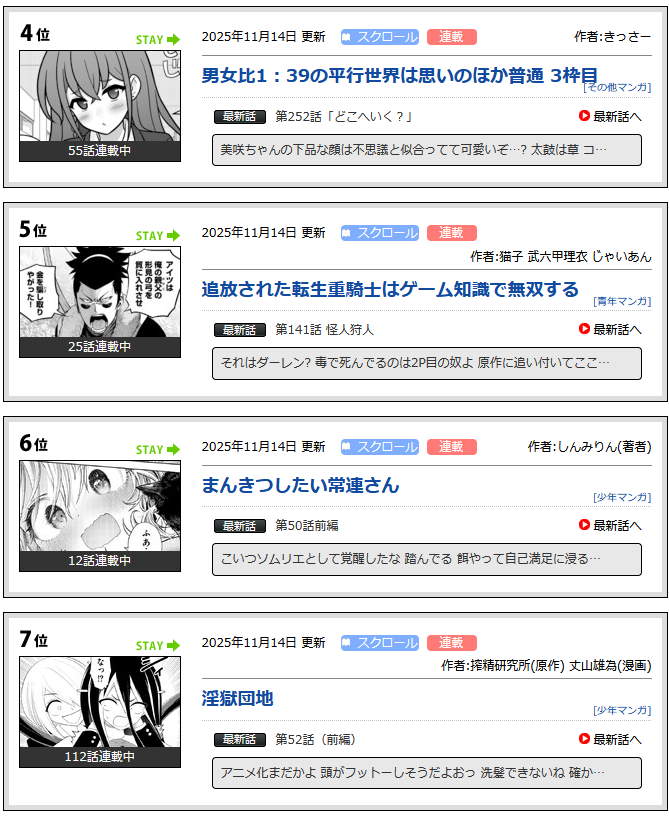 https://www…manga.nicovideo.jpまんきつしたい常連さん / しんみりん(著者)最新話:第50話前編 2025/11/14更新。再生(累計): 8280128。 マンガ喫茶で働く大学生・泉には気になっている常連さんがいた。それは最近よく来店する女子高生のほなみちゃん。どこか無防備で可愛らしい彼女には、…manga.nicovideo.jp淫獄団地 / 原作:搾精研究所 漫画:丈山雄為最新話:【プレゼント応募受付中!】人妻総選挙...結果発表...ッッ!!【第7巻発売記念】 2024/10/09更新。再生(累計): 25087354。 加筆もたっぷり♡コミックス最新第6巻好評発売中!!!