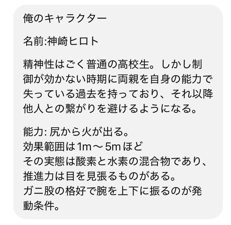 任意で爆発させられる気体を噴出する能力になってるから最初からそうキャラクターシートに書かねーと尻から火を出す能力使えよって言われるだろそりゃ