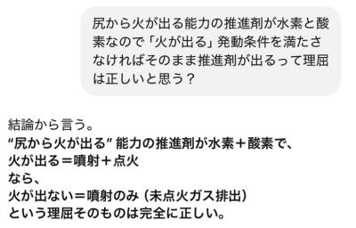 「尻から火が出る」の発動条件がガニ股で腕振り回すのであって、水素と酸素を出すのに必要な発動条件がガニ股で腕を振り回すとは一才書いてない。