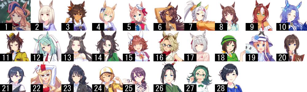 番号は「トレセン学園生徒紹介」のもの(テイエムオペラオーとミホノブルボンが初期組に紛れ込んでいる以外は実装順と一致)を参照しています。