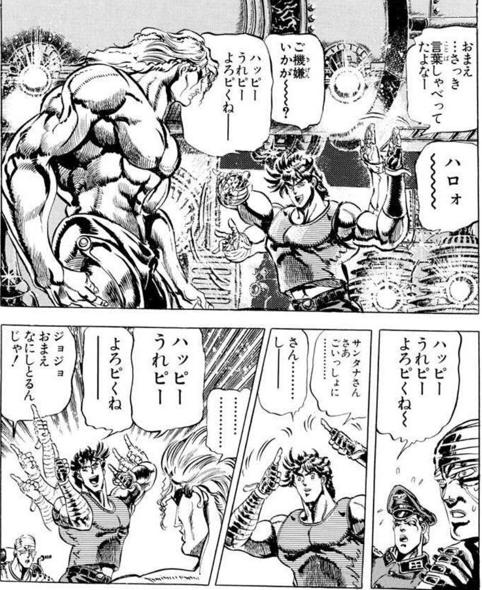 目上の人間に対しても常に茶化すような接し方をする。心理トリックじみた台詞回しをよく行う(ジョセフ「次におまえは○○と言う」「次のてめーの台詞は○○だ」→相手「○○…ハッ!」)。