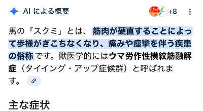 あまりにひどすぎてまともに動けなくなる(=馬の場合命にかかわる)レベルの筋肉痛ってイメージだけど実際どうかは知らん