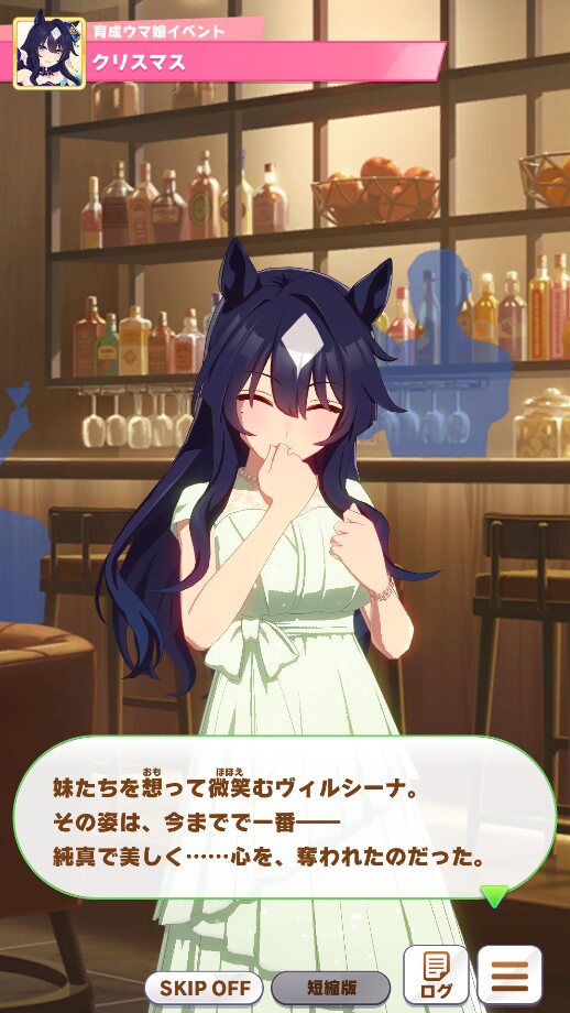 正直ヴィルシーナはこう見えてまだ中等部なので、いくら見た目とかが大人びててもまだトレのなかでは子どもっぽいっというか、クリスマスの時も普段は本当に可愛い教え子として見てる感じだった。実際にシナリオ中でも人には見せない幼い姿とかずっと見せてきた関係だし。