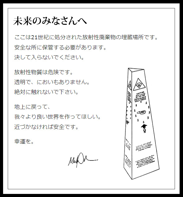 異文明への伝言と言ってもゴールデンレコード、パイオニア探査機と色々有るがこの放射性物質最終処分場の警告文こそが最もロマンのある伝言だと信じている
