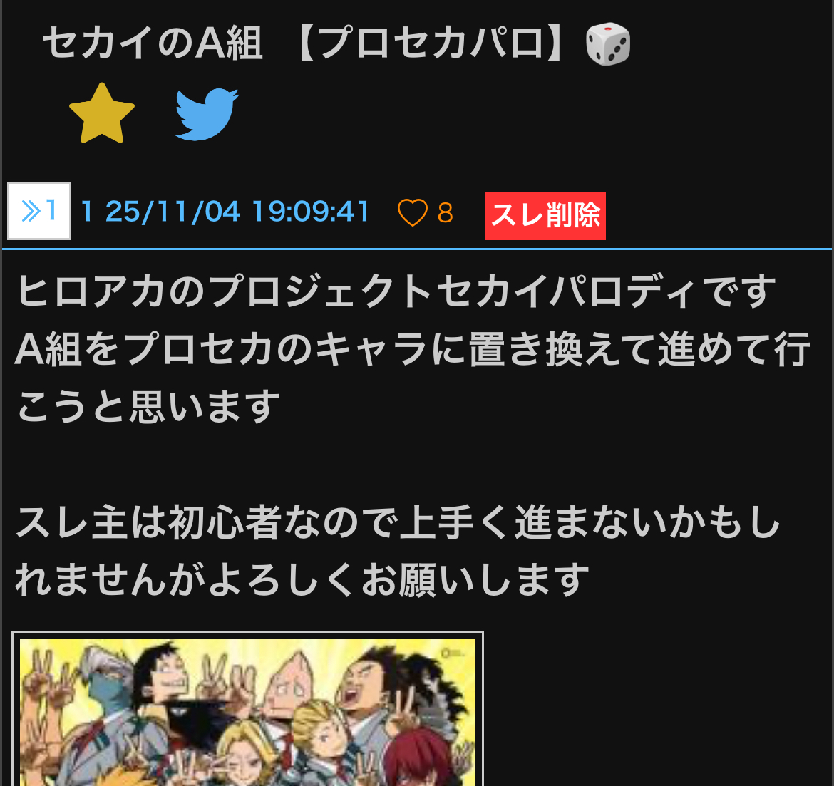 高校1年生の常闇踏陰は幼馴染の障子目蔵とバンドを結成する。その後、疎遠になっていた幼馴染の緑谷出久と和解(?)して出久もバンドに加わる。だが、もう一人の幼馴染、峰田実は友人関係のトラウマから3人を避け続けていた。出久は実と話に行くが結局解決できず・・・ - 5125/11/24(月) 20:18:38