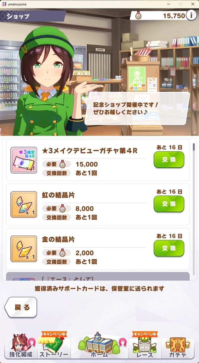 ただ、「そのアカウントが始めた時点までにいた全キャラ/全サポカ」と交換可能な特別な有償チケットがあって、これでなら特別キャラは交換可能。