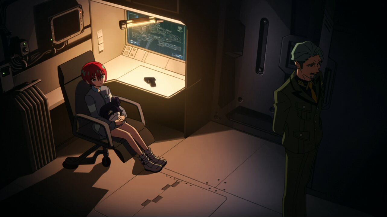 マチュとすれ違ったコモりんが(あれ…?マチュから中佐と同じ匂いがするような…まさかね…)と怪しんでしまい、こそこそとマチュとシャリアの様子を伺うようになる