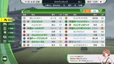 使い分けの結果だけどJCがセイウンスカイ(欧州三冠・所有) VS スペシャルウィーク(NPC) VS グラスワンダー(所有) VS モンジュー(NPC)とかいう