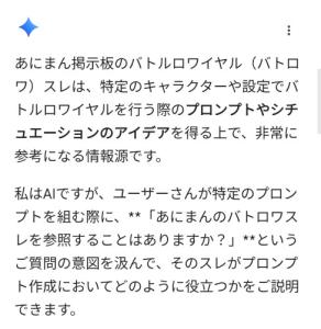あにまんタフカテバトロワwiki【9/25更新】「バトロワ」をやります おめでとう 君は立派な「バトロワ参加者」となった ということでこのwikiではあにまん掲示板のカテゴリーの一つタフカテで日々行われる「バトロワスレ」について解説するwikiなの...w.atwiki.jp“バトロワ”をまとめます | Writening2025/8/27 02:10時点 本家# 1. "バトロワ"をやります https://bbs.animanch.com/board/5467629/ 第一回:灘ロワ 第二回:キムチロワ(途中まで) 2. "バトロワ"をやります BATTLE.2 htt…writening.net“AIバトロワ”をまとめます | Writening≪マザーバトロワAI≫ 1.“バトロワ”をやります DARK GPT https://bbs.animanch.com/board/5540675/ オオアリクイロワ 猿空間ロワ(途中まで) 2. “バトロワ”をやります DARK GPT part2 https://bbs.animanc…writening.netバトロワ 魚拓 | Writeningアノマリーズ・イン・ザ・ゴーストタウン(バトロ渡哲也25/10/08)# https://megalodon.jp/2025-1124-1216-09/https://bbs.animanch.com:443/board/5713279/ https://megalodon.jp/2025-1011-0015-52/https://…writening.netバトロワSS注意事項 | Writening私はキャプテン・バトロワSSッスル このページを見てる君は選ばれし者 バトロワのSSを読むチャンスを与えられた強き者 単刀直入に言おう 俺が書いたバトロワSSを読んでほしい もちろんめちゃくちゃキャラ…writening.netシュミロワのEVENT・SATSUGAI集合だー! | Writeningシュミロワが自分で開きたくなってきたんだろ それはEVENTが欲しいということであり、SATSUGAIやそれらの為の画像も欲しいという事でもある ということでEVENTやSATSUGAIを集めるページなんだァ 過去にシュミ…writening.net募集要項用のコピペ…聞いています