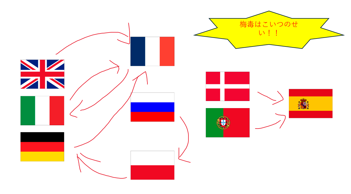 実際のところ梅毒は新大陸から持ち込まれた病気だったはずで、そうなるとやはりスペインということになるんだろうか