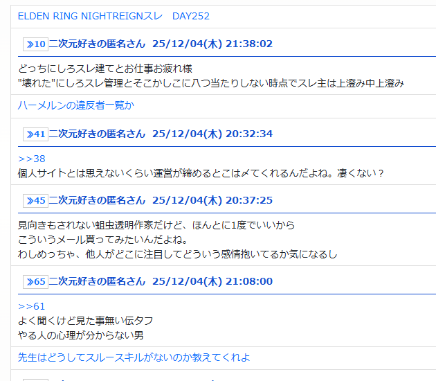 【酉有】ELDEN RING NIGHTREIGNスレ DAY251|あにまん掲示板尻来たれり自分本日出社で管理できないためエアプ荒らし(正式名称:マンカス君)は無視するなりボコボコに愚弄するなりしてあまりにも邪魔ならスレごと爆破をお勧めしますそれか口出しできないようマッチング募集な…bbs.animanch.com - 2二次元好きの匿名さん25/12/04(木) 21:25:49