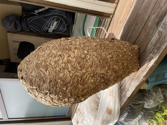 頭半分より小さいくらいだったら市販の蜂ジェットみたいな1000円くらいの殺虫剤買ってきて夕方~夜に吹きかければ大体何とかなる