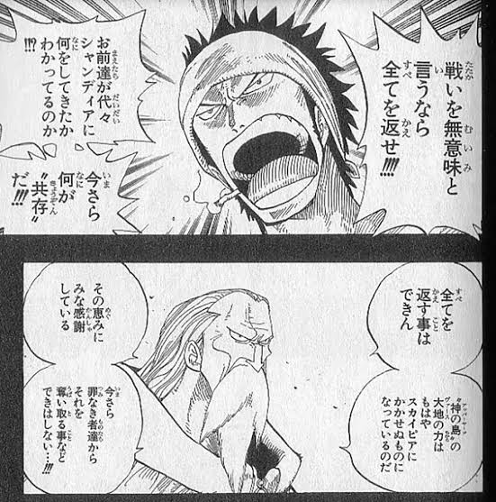 始まりはスカイピア側が略奪したって所から始まってるからシャンディア側の主張は正当っちゃ正当なんだけど、空の騎士のおっさんとしては『じゃあ全部一気に返します』とは言えんわな