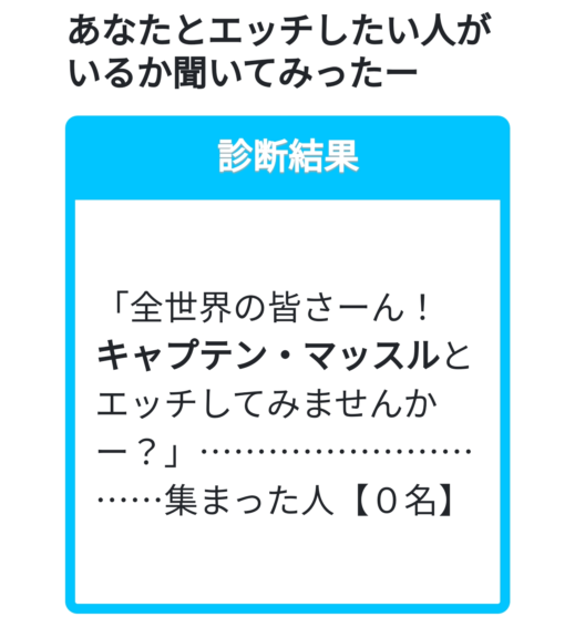 「全世界の皆さーん! キャプテン・マッスルとエッチしてみませんかー?」…………………………集まった人【0名】