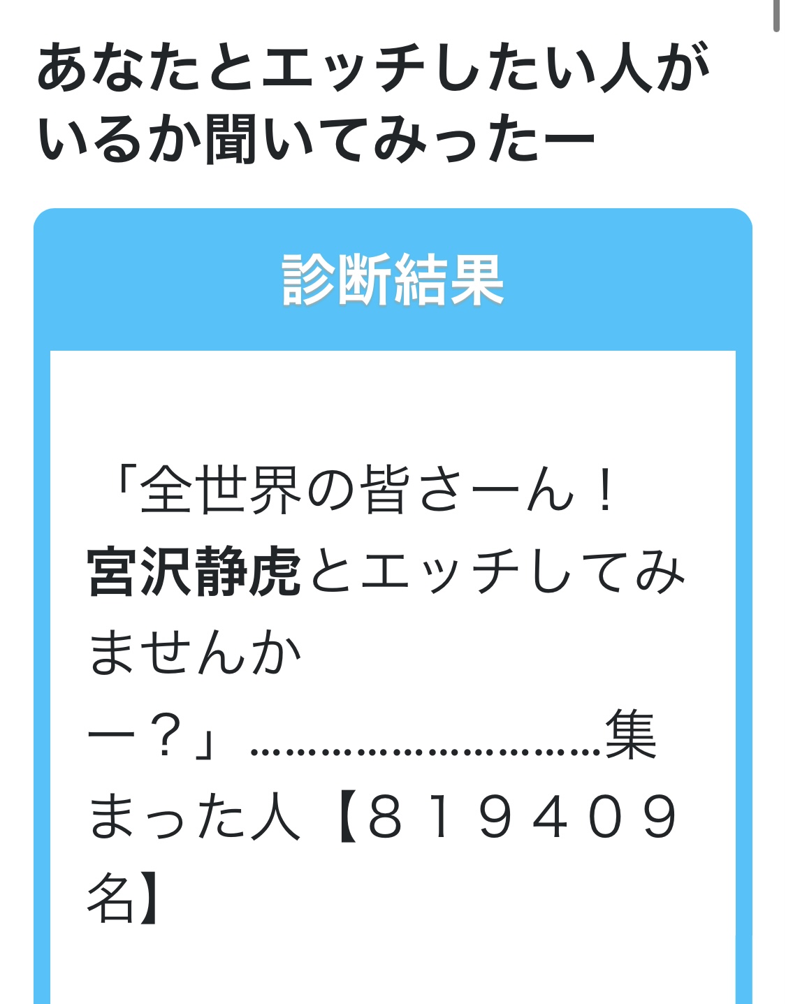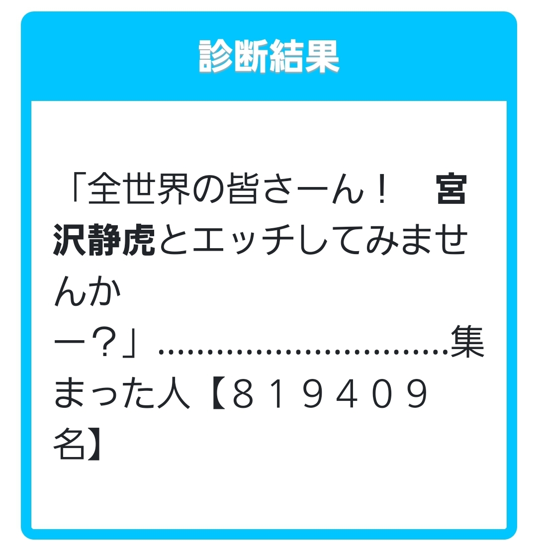 あなたとエッチしたい人がいるか聞いてみったーエ ッ チ し た い 人 い ま せ ん か ー ?shindanmaker.com - 2二次元好きの匿名さん22/05/19(木) 21:44:35