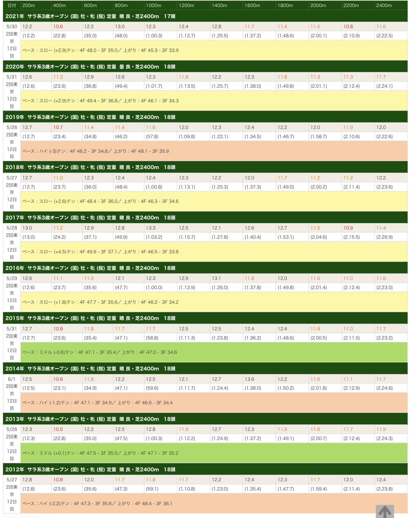 19年みたいに前半57秒台で飛ばす馬がいると後続も速くなるけど、そうでない限りは基本的にスローペースになるもん
