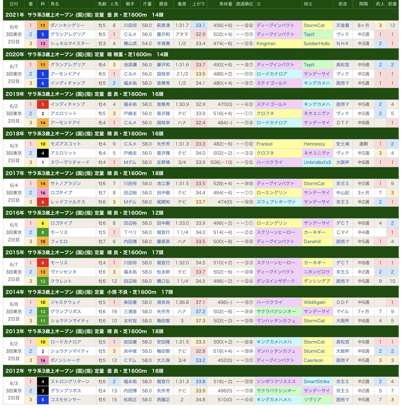 これに当てはまらなかったのはグレード制導入以降でも87年2着サニースワロー、10年エイシンフラッシュ、11年ウインバリアシオンの3頭のみ、しかも10年は歴史的スローペース、11年は歴史的不良馬場とアブノーマルで、ほぼ考えなくて良いと思うもん