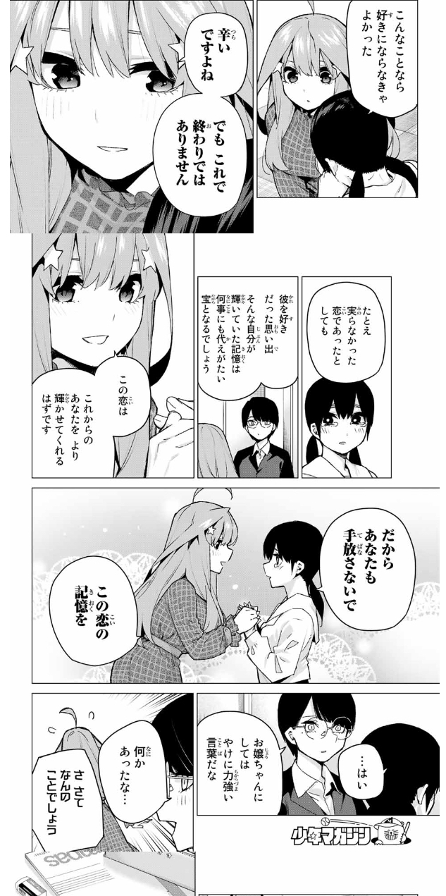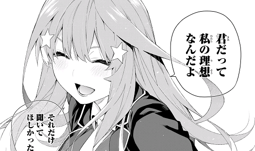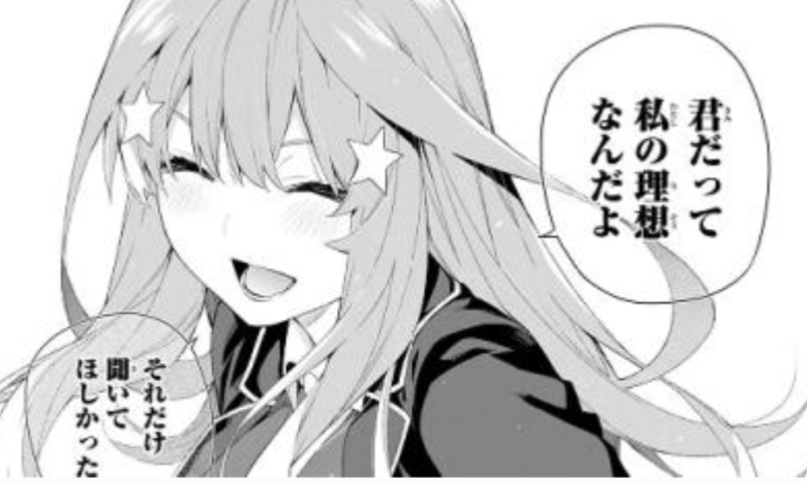 風太郎目線では唯一自分のことを好きにならなかったという点で五つ子の特異点だから個人的には恋心が消えても墓場まで持っていってほしい派