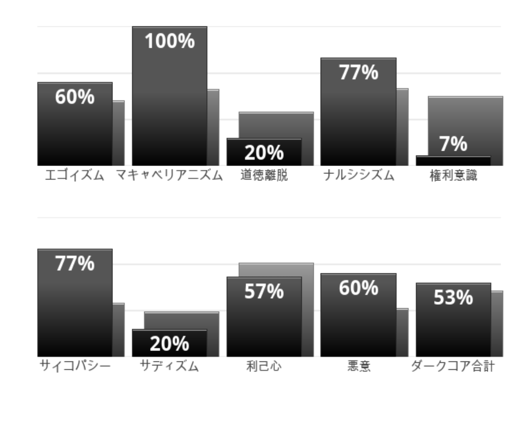 エゴイズム・マキャベリズム・悪意が非常に高く、ナルシシズムと権利意識もまた非常に高い 後サイコパシー・サディズムも若干高く他は平均的