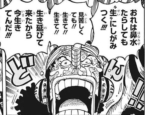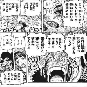 お玉のきびだんごはウソップがいないとあんなポンポン口に押し込むことはできなかったし、何よりここを死に場所にする覚悟の「散り様の美学」を持つ侍たちに、情けなくても生きることの大切さを教えるのはウソップにしかできないと思う。