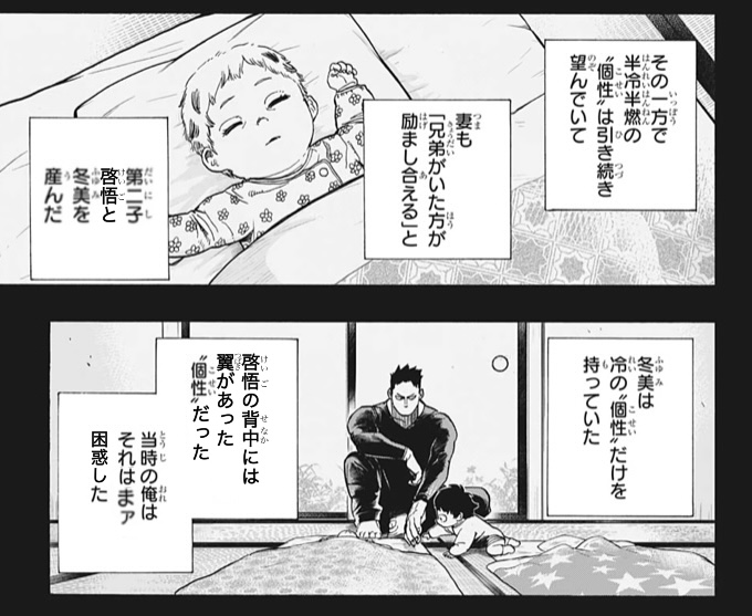 当のエンデヴァーは夏雄や焦凍が生まれたときはあきらかにほっとした顔をする