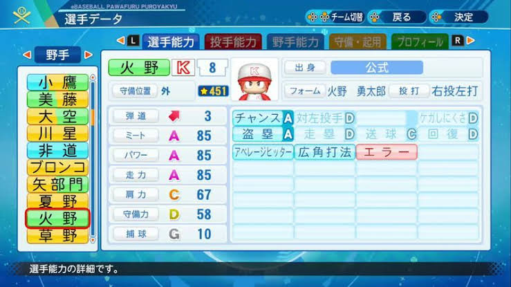 打率高い、ホームランは少い、守備が上手い、投手も一応できる(やってた)、オペならこんな感じだと思う