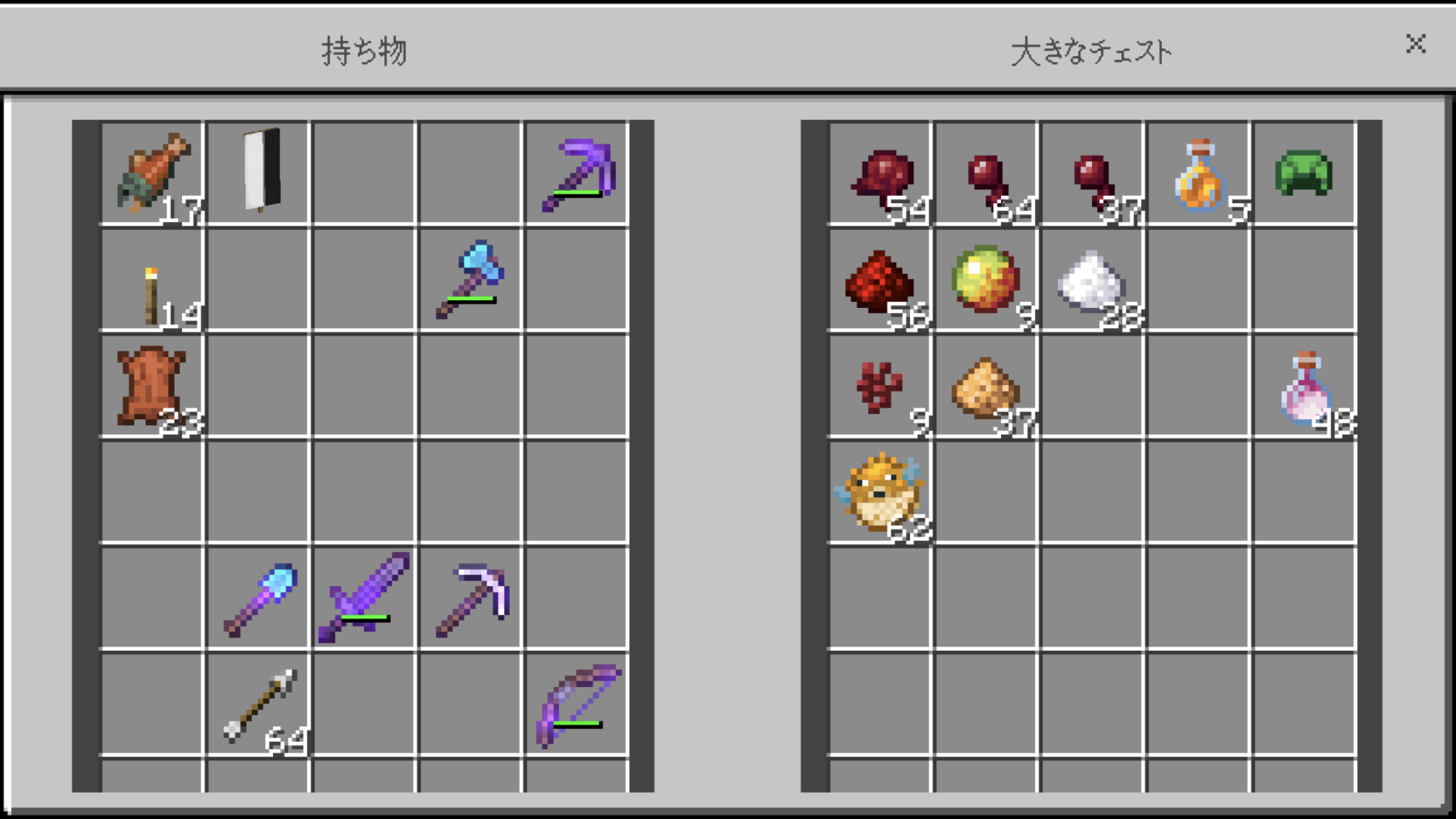 ついでに言うと、ポーションの入ってるチェストの1番上とその隣のチェストに釣りで手に入ったものが入っている 基本は釣り堀に置いてあるが、仮に魚を仕舞いたいマネモブがいたらごま塩程度に覚えておいてくれ...