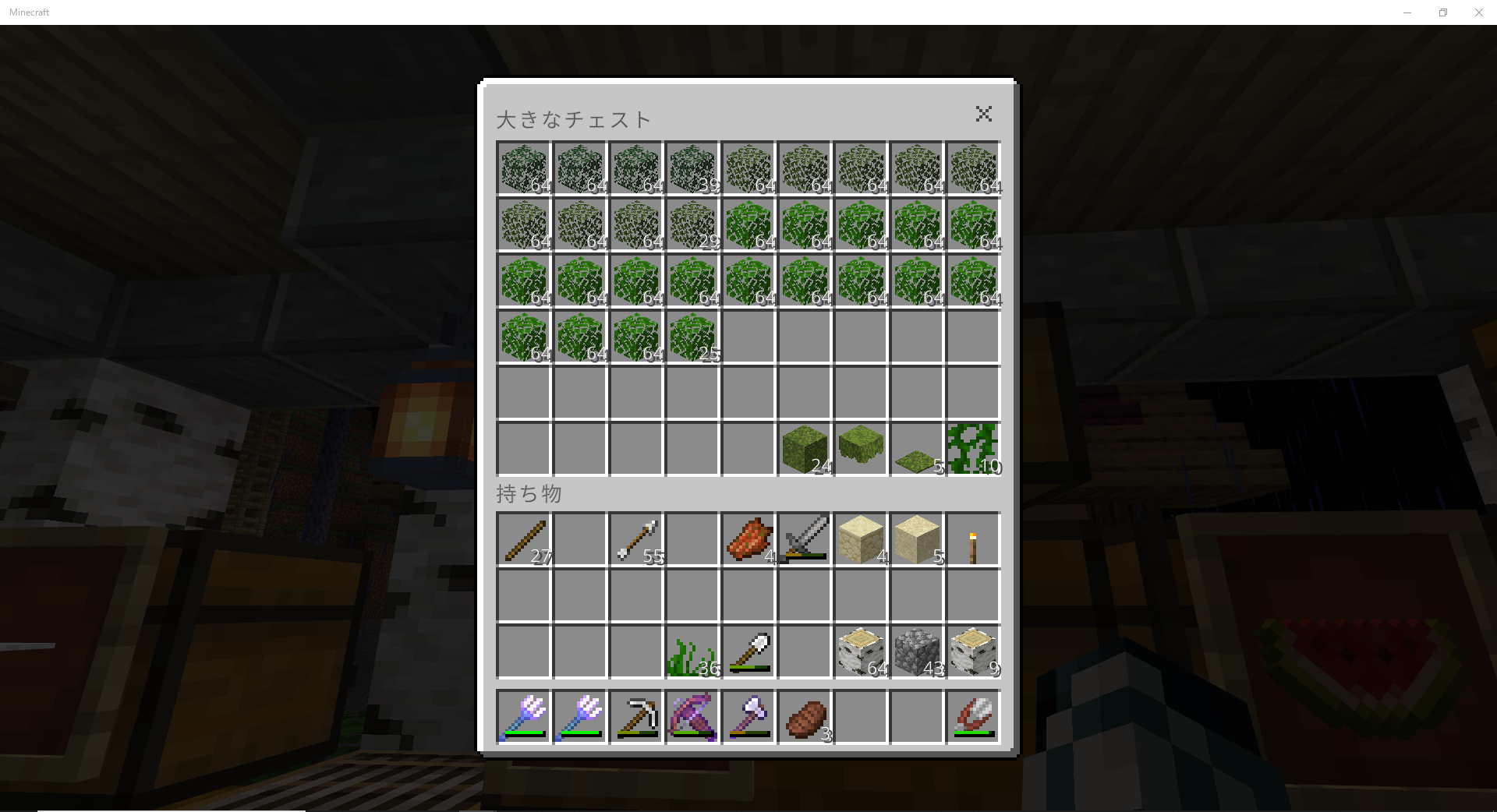 シェルカーTTの方はまだどうにかなりそうだが、天空TTの方に葉っぱブロック49スタックが必要なことが発覚した 64個が1スタックだ