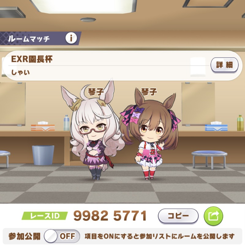 パスワードはサークルチャットに書いておきました、ランド8で対抗戦に参加する方は、8.9合同会議室にて出走させられる子の報告をお願いします