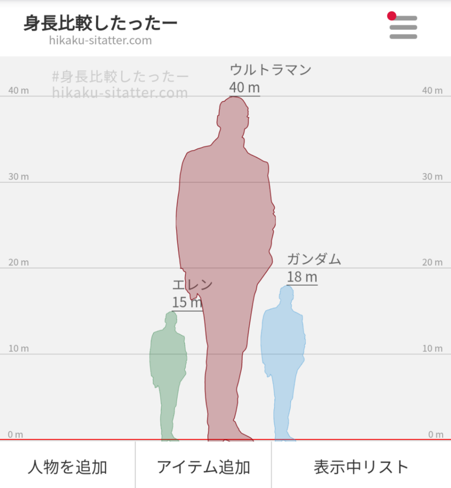 身長比較したったー|身長の比較図が作れる便利ツール身長比較したったーは人物同士の身長差や人物と物の高さが比較できるツールです。名前・身長・性別・色を選択して入力できます。hikaku-sitatter.com - 2二次元好きの匿名さん21/09/28(火) 15:42:49