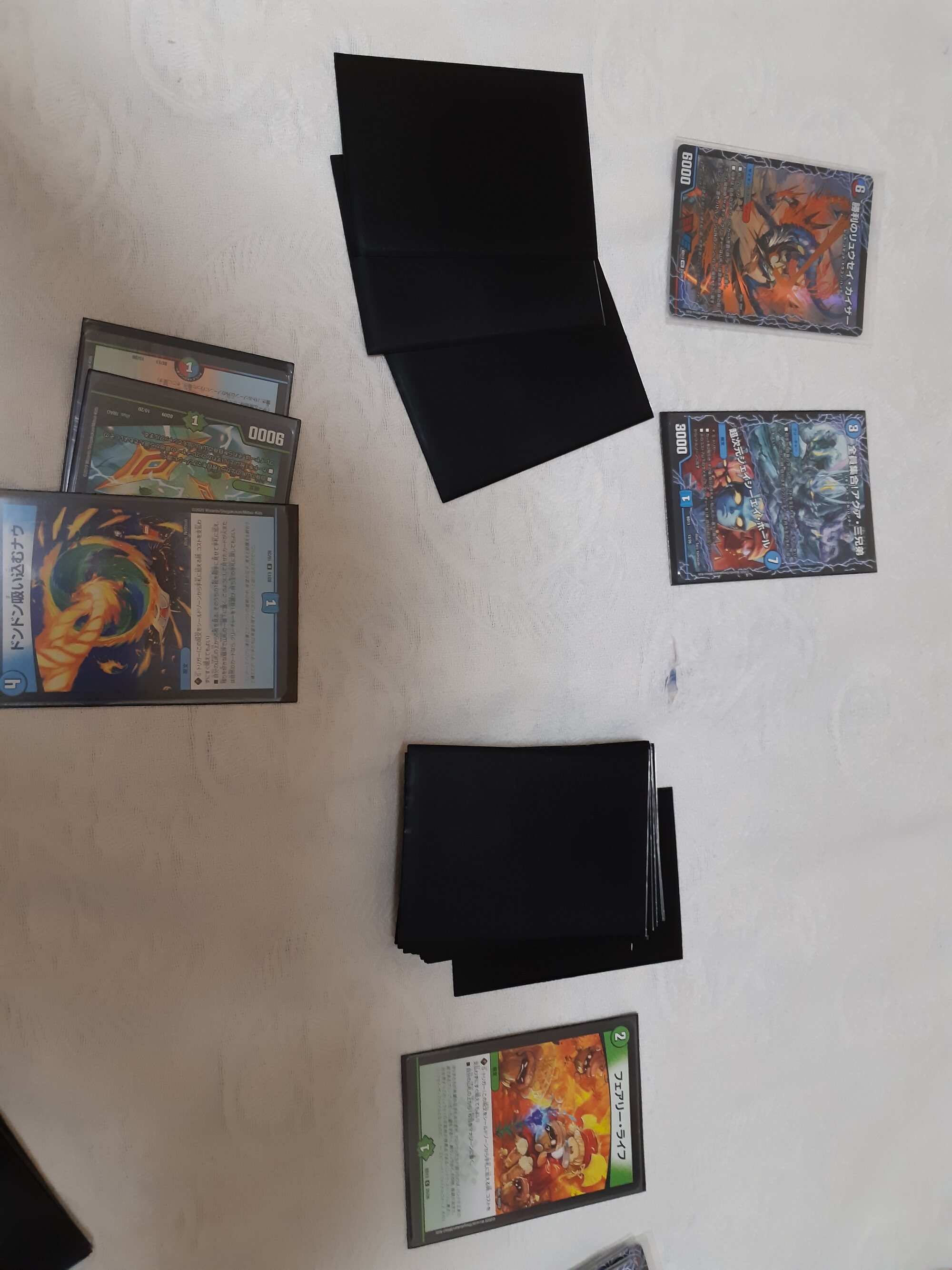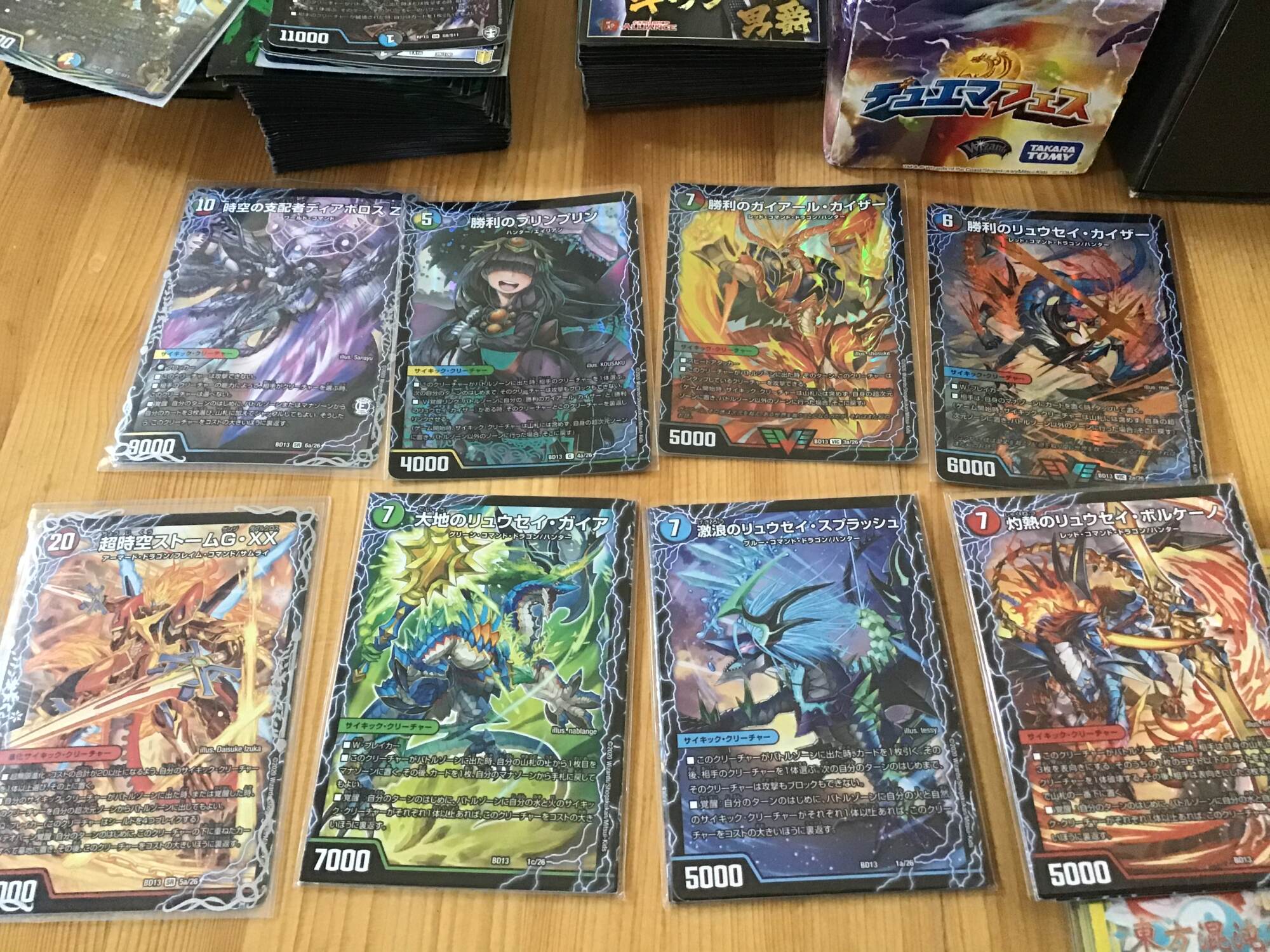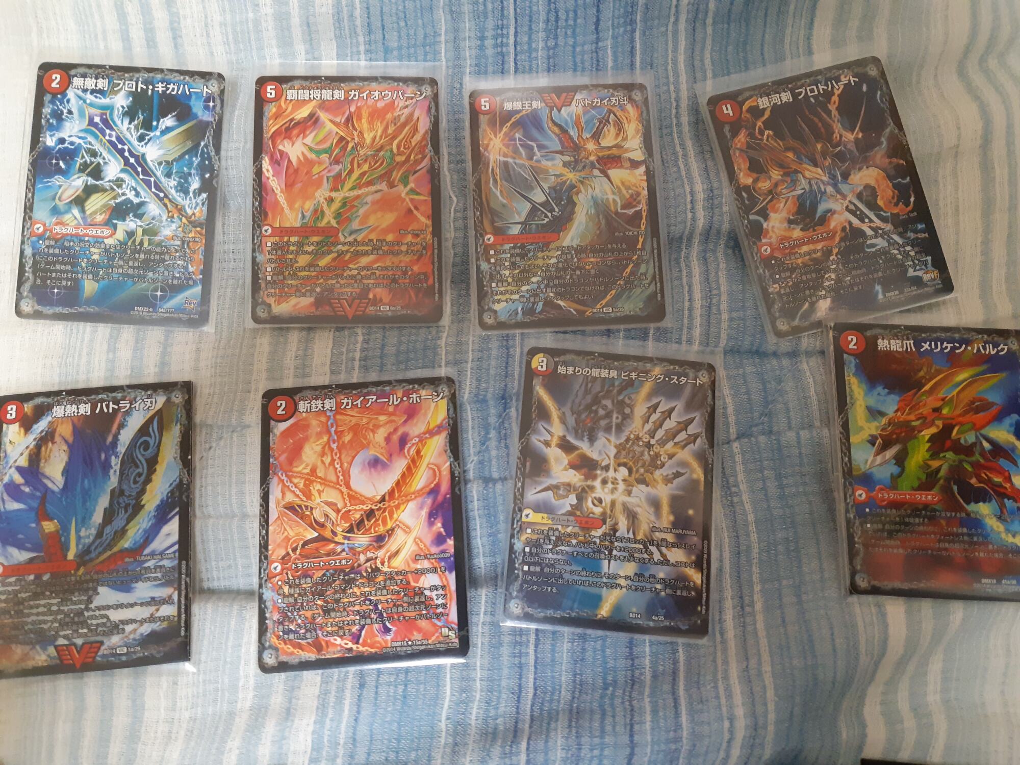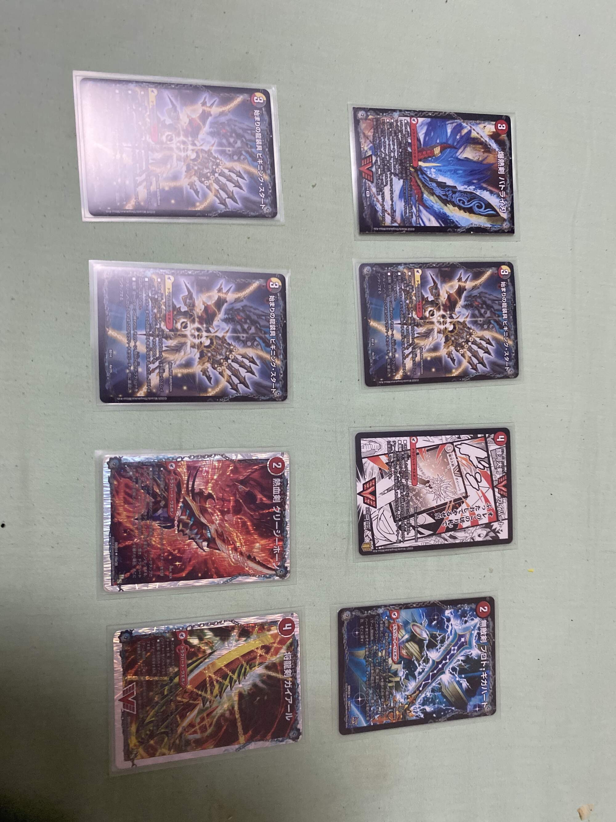 ドロー、最終龍はロージアマナにお当て四マナ払って爆竜覇ヒビキ召喚、バトライバ装備、ハヤブサリュウを進化元にした方のボルシャックドギラゴンで攻撃時革命チェンジ、蒼き団長ドギラゴン剣を出します、効果でその子供、可憐につきをだします、左端からトリプルブレイクです