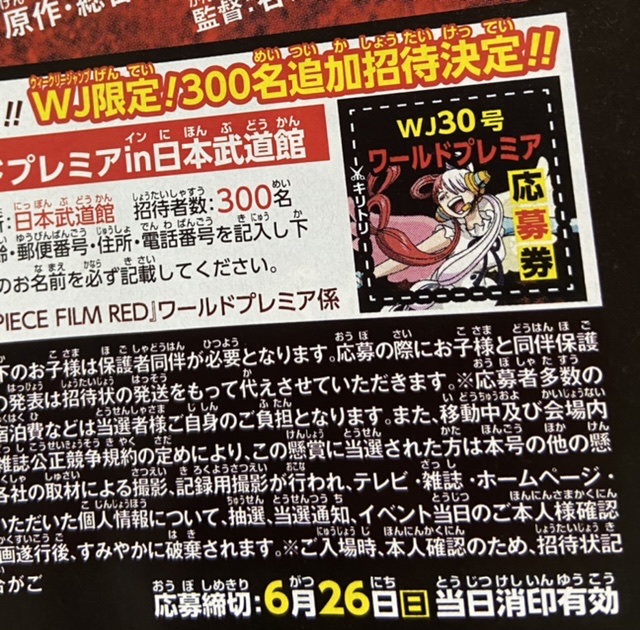 6月27日発売『週刊少年ジャンプ』30号での『ONE PIECE FILM RED』 ワールドプレミア追加ご招待に関しまして、応募締切日時に誤りがございました。