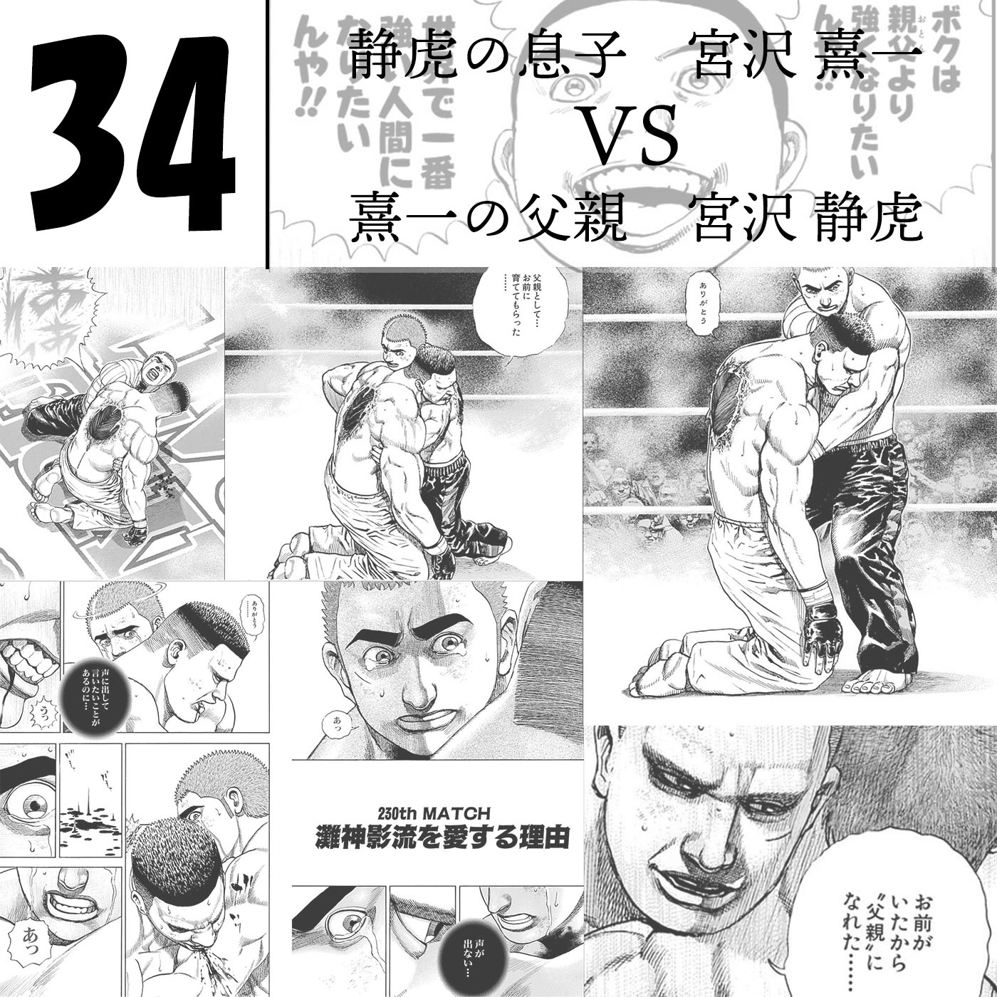 『その小さな虎には母親が居なかった 父親は狩りの仕方 闘い方 種族としての掟 自然界の厳しさなど生きていく上で必要なあらゆることを愛情を持って教え込んだ やがてその虎は大きく逞しく成長し 立派な若虎となったが…… 父親は若虎となった我が子に対し命懸けの闘いを仕掛けるのだった 誰もこの闘いを止めることはできない それが 虎として生まれた宿命なのだから…』『熹一は強くなります 父と本気で闘えるほどに…!! いずれ父を超えていくでしょう 極論を言えば父は息子に殺されることを望んでいる… その日が父にとって最上にして最高の瞬間なのです‥!! だからこそ手加減などしない…!! 本気で潰しにかかる…!!!』