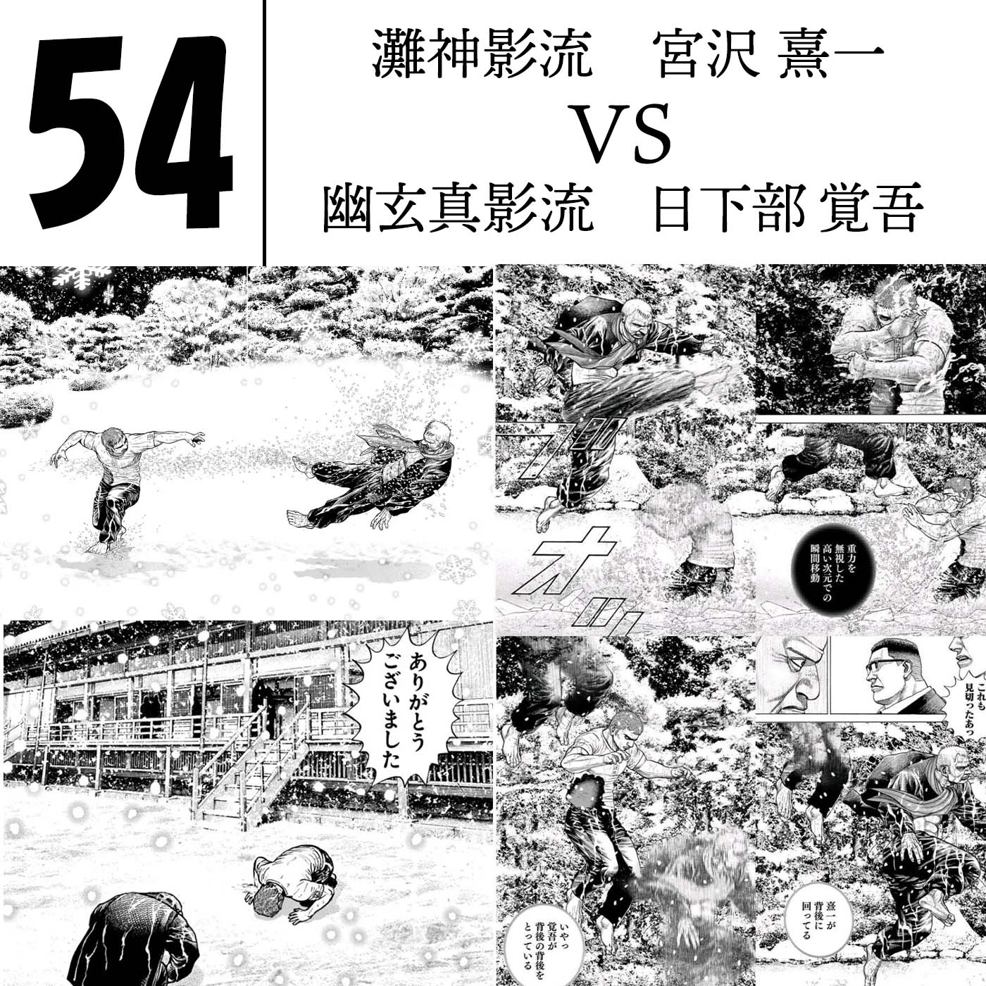 オカルト技ばかり話題に出るが双手穿孔拳や四玉突きなど純粋に殺意が高すぎる技も多数ある。ちなみに鬼龍のおじさん曰く幽玄は打撃に特化した武術らしいが塒固めや象塊などトリッキーな技も多い。宮沢三兄弟+幽玄死天王による戦闘解説は余りにも豪華。恐らく世界最強9人があの場に集まっている。