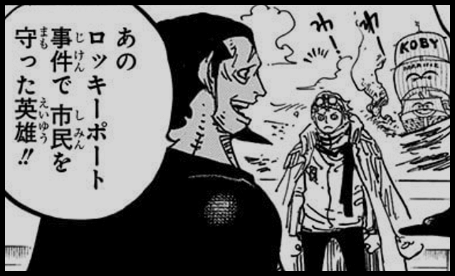 ・海賊と海軍の激しい戦闘で民間人に被害が出そうになるところをコビーが活躍し被害を抑える