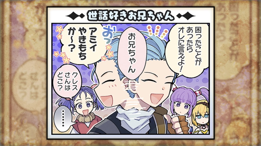 ルドガーはゲームでは喋らないらしいけどめっちゃ喋る、エルは可愛い、ヴィクトルは料理作ったるわーみたいなシーンでいい人だと思ったしユリウスは甘いお兄さんって感じで割と好きだが眉毛の傷が気になる