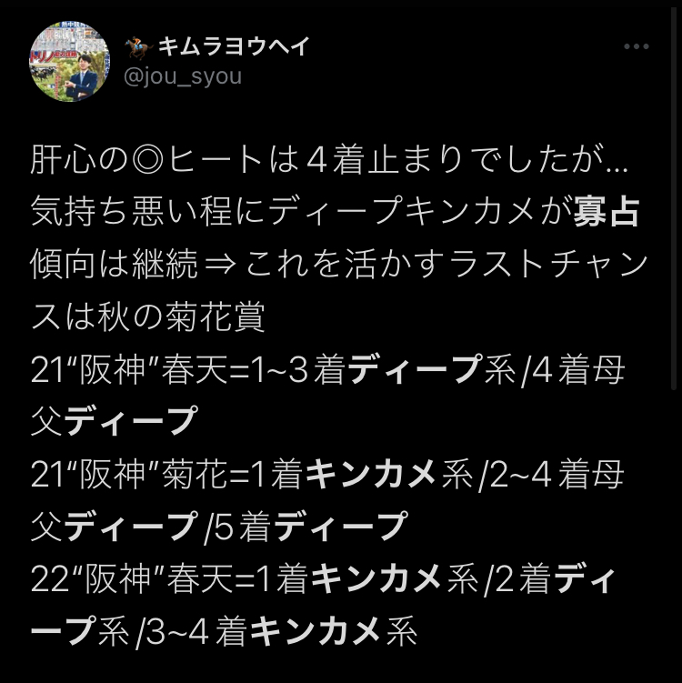 実力ある馬にとってはぶっちゃけ古馬と戦う秋天より世代戦の菊の方が勝ちやすいんだしな - 139二次元好きの匿名さん22/07/12(火) 08:41:43
