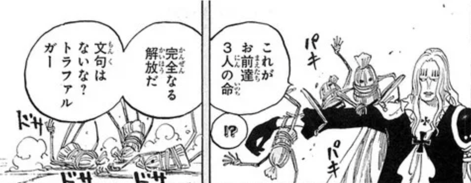 これはローにつけられてた海楼石の拘束とドレークが外して、ホーキンスが油断してるところを不意打ちしただけでは