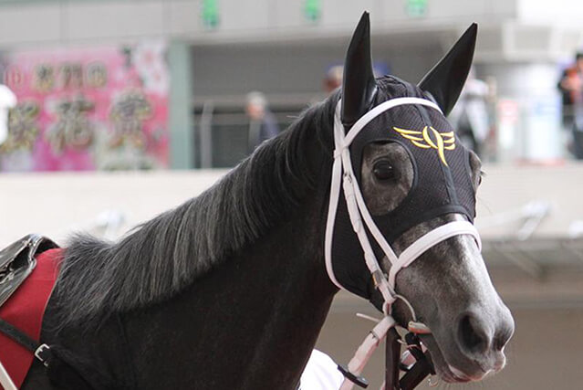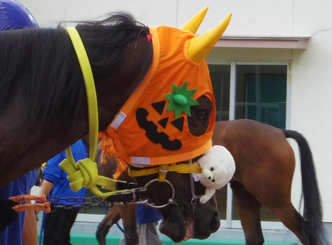 須貝厩舎の格好つけたメンコ