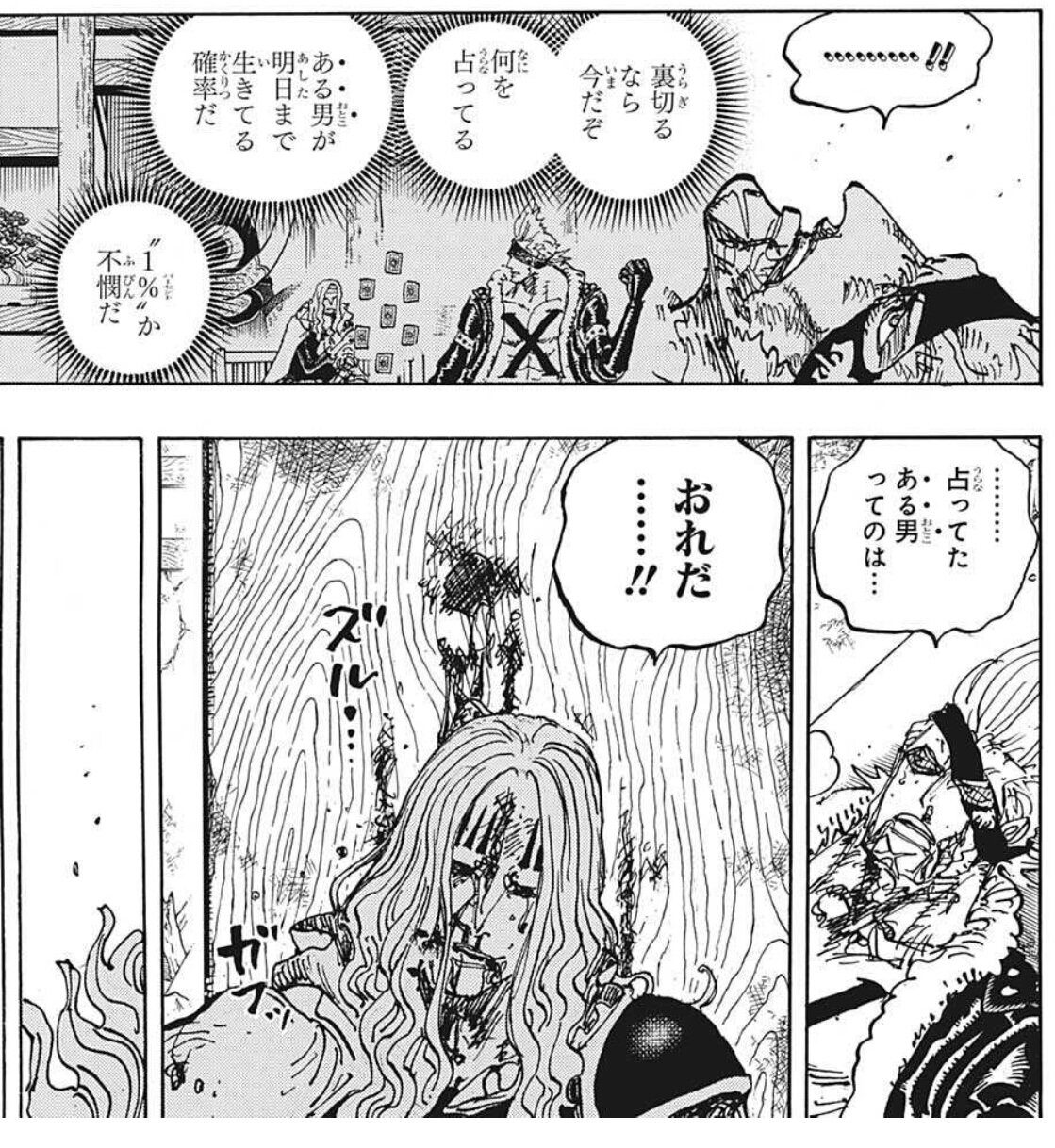 同盟に誘われて断って帰ろうとしたらカイドウ落下、同盟相手は実は裏切ってた、仲間もいない、百獣とおそらく気が合わない、こき使われる、そこそこ仲良いと思ってた同僚実はスパイ、他の同盟仲良さそう、カイドウに挑んで行ったヤツらは成功してて多分自分を恨んでる、そして99パーセントでもれなく死ぬ