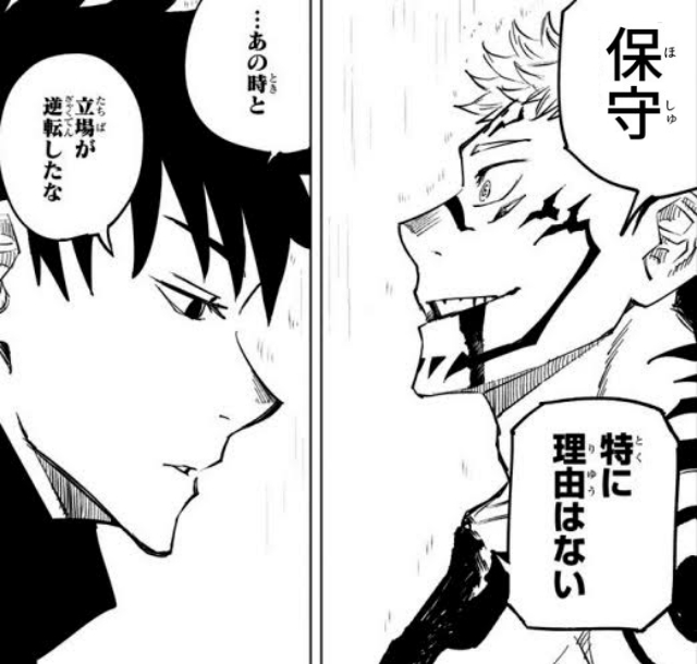 伏黒に対しては勝手に魅せられるのに重面はきれいに半分に卸すからいいんだよね。いかに伏黒が大事なのかわかりやすくて助かるし腐の妄想が公式に劣ってると感じるくらい愛情深い行動の数々を披露してくれる宿儺は名実ともに呪いの王だなって